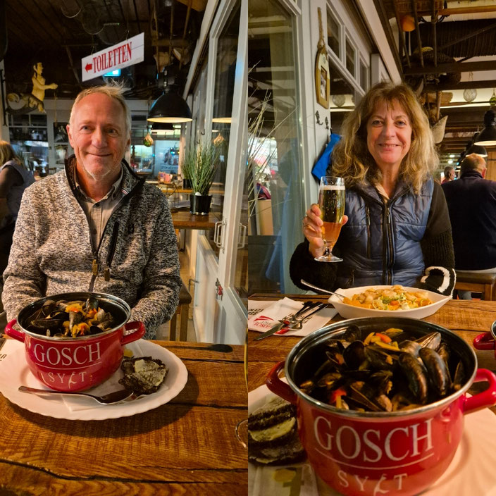 Abends fahren wir mit dem Smarti noch kurz nach List, um in der Alten Bootshalle eine Runde zu "goschen". Für Angie gibt's die Thainudeln mit Scampi und für mich einen großen Topf Muscheln. Beides wie immer sehr lecker.😋